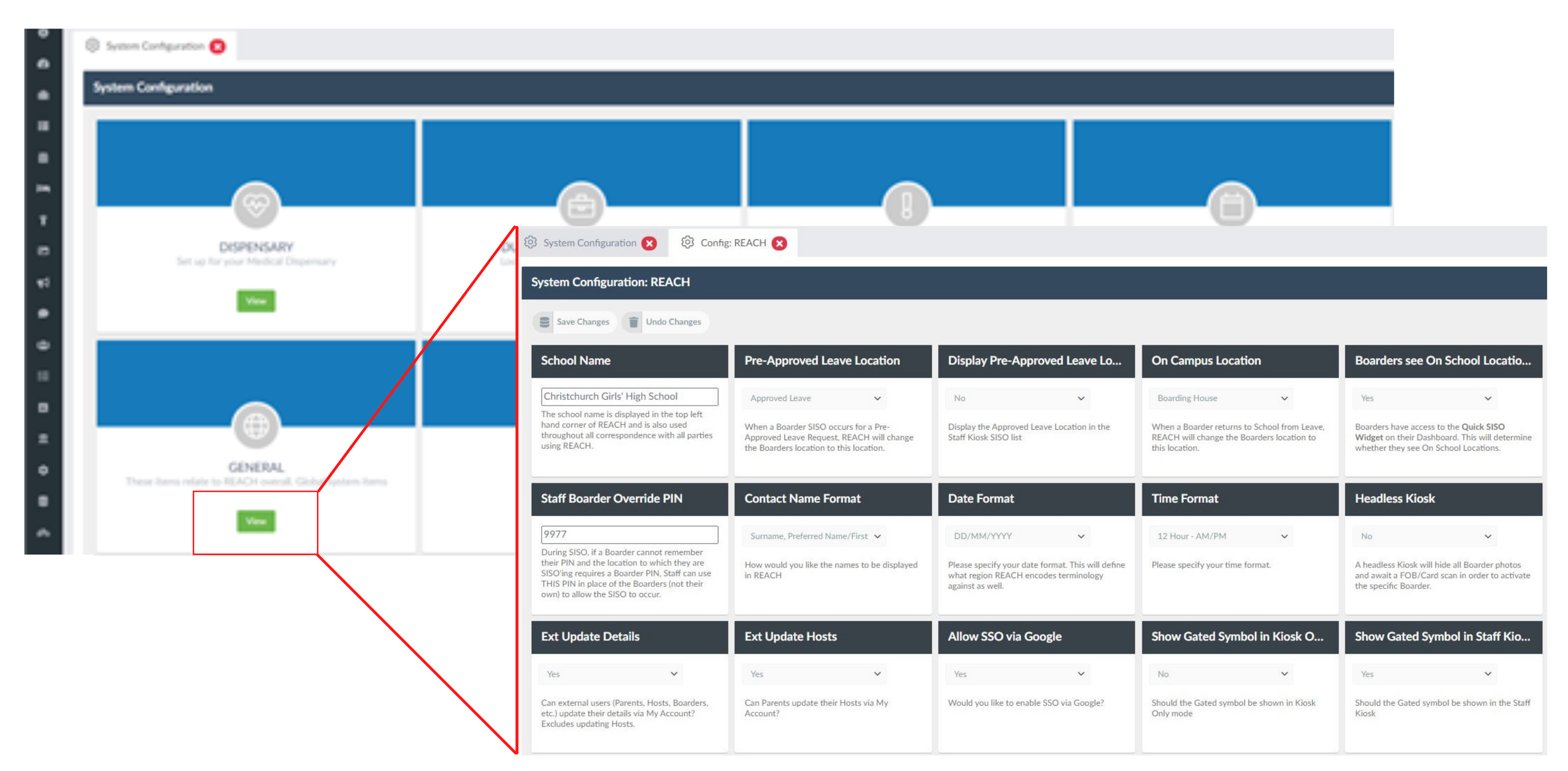 Items in System Configuration >> General, are the base settings of primary elements within Reach that apply across all modules.