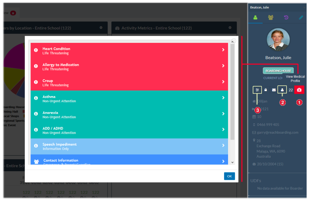 Open the Student Sidebar and in the student's view click on the View Medical Profile icon.