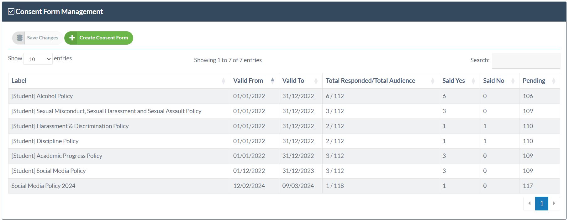 If you are tracking the activity of a specific consent form for a one-off event, you can quickly view the data here, with yes/no/pending.