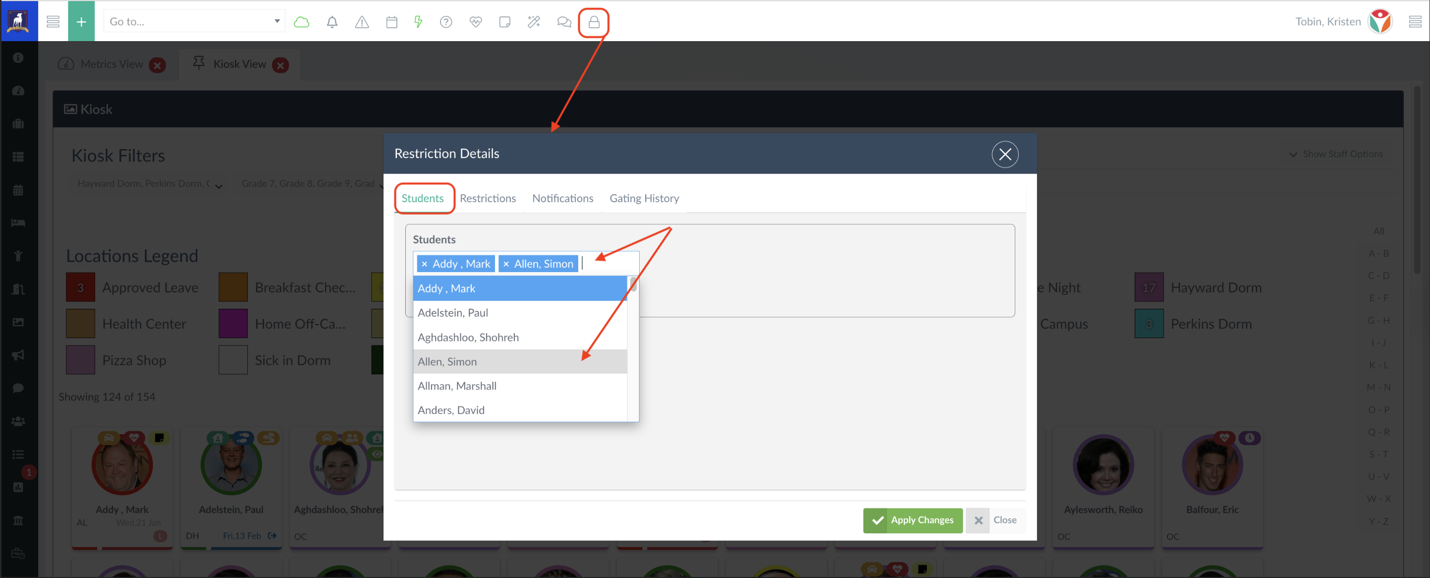 Gating or Grounding students is done on the Restrictions Modal which allows you to apply multiple restrictions in combination or individually depending on the protocols that you implement in your operations.