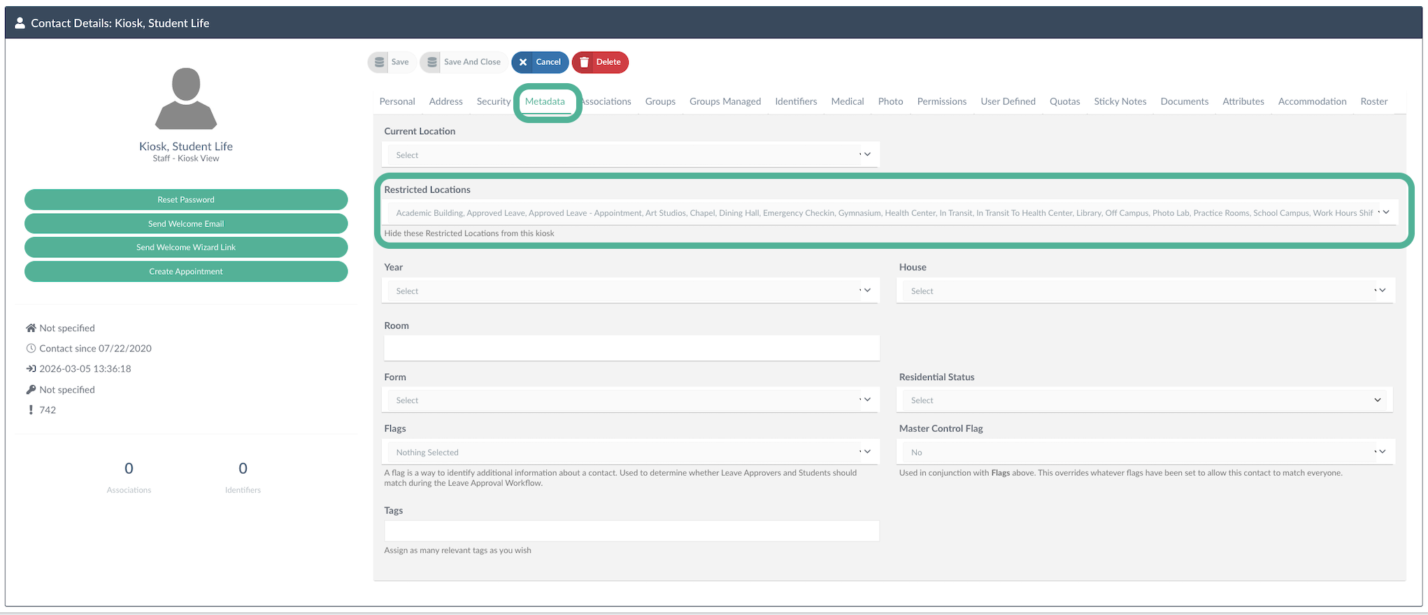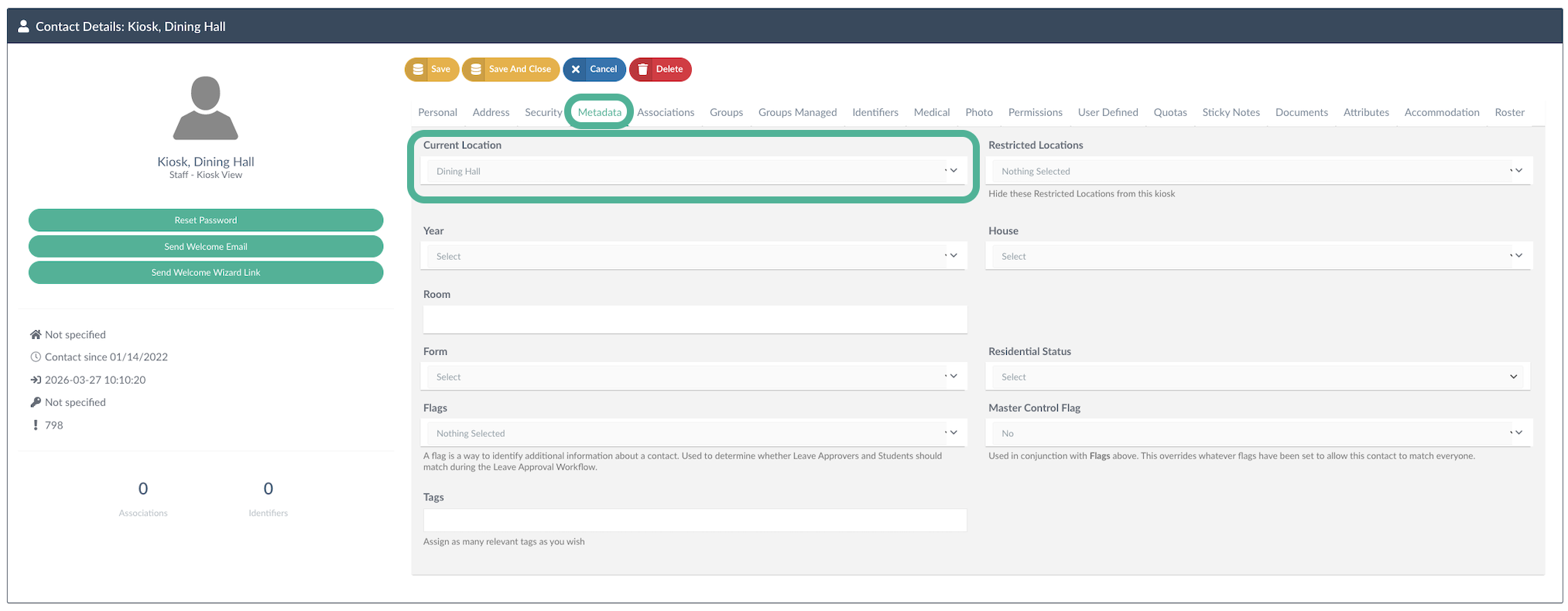- If you're using a QR code or RFID card reader with the Kiosk, you have the option to set the Kiosk to a particular location. Scanning the QR code or RFID card will change the user's location to that specified location. In the Metadata Tab, select the Kiosk's location from the Current Location drop down menu. See How to Activate QR Codes to learn how to set up QR codes with your Kiosk.