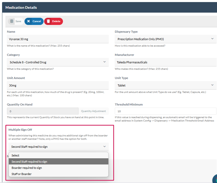 The setting selected will determine what second person options are available when assigning the medication to a student in step 2.