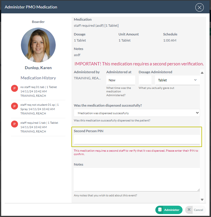Second person verification (2PV) can be implemented in order to collect a confirmation from a second staff member or from a student when administering a medication. Verification is achieved through collecting the PIN of the second person in the administering modal when the medication is being given to the patient.