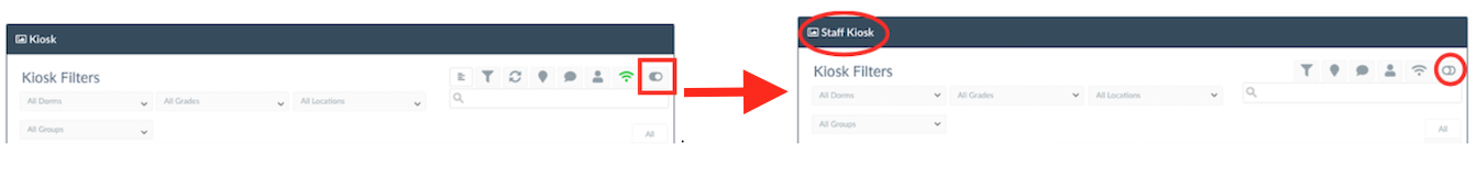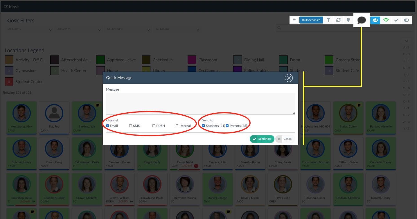 Switch your Kiosk view from students to staff by switching the toggle in the top right of the Kiosk Screen. Use the same steps as outlined in the student and parent section above to send your Quick Message to a group of staff.