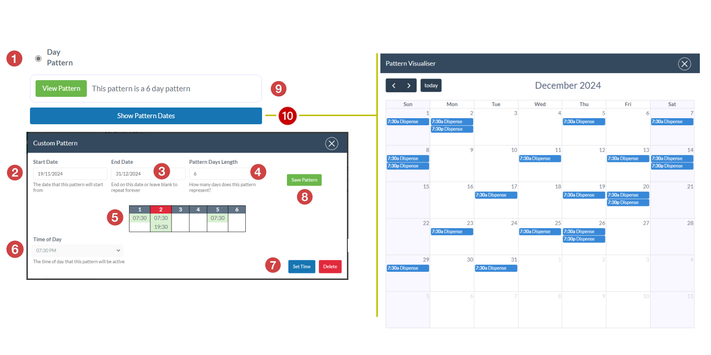With Custom Patterns you simple select from a calendar view the date and time that you want to schedule a medication dosage for. You can build the frequency schedule out over whatever date range you need to and you can schedule multiple dosage per day if required.
