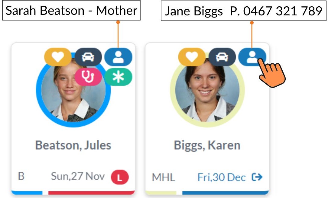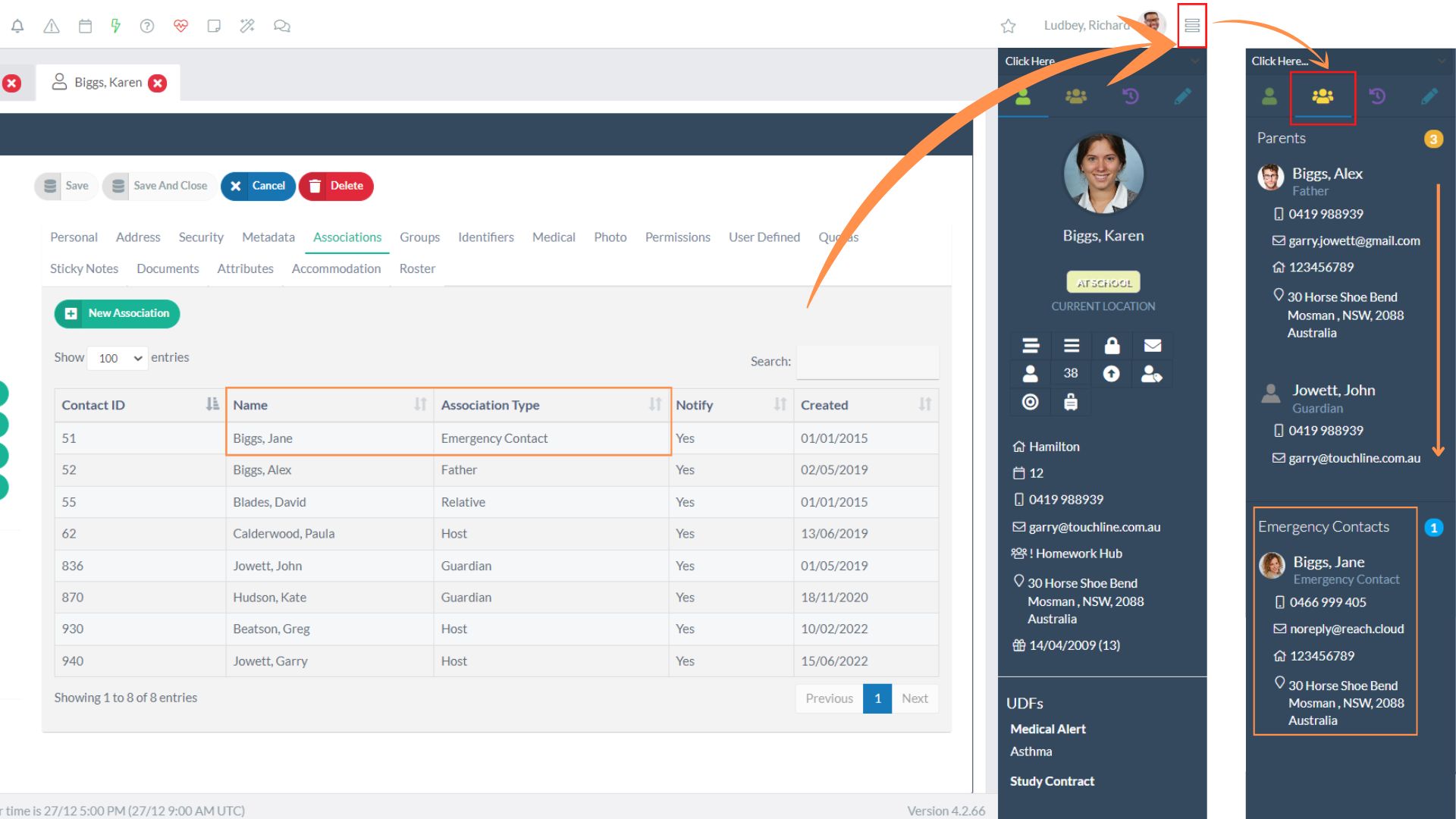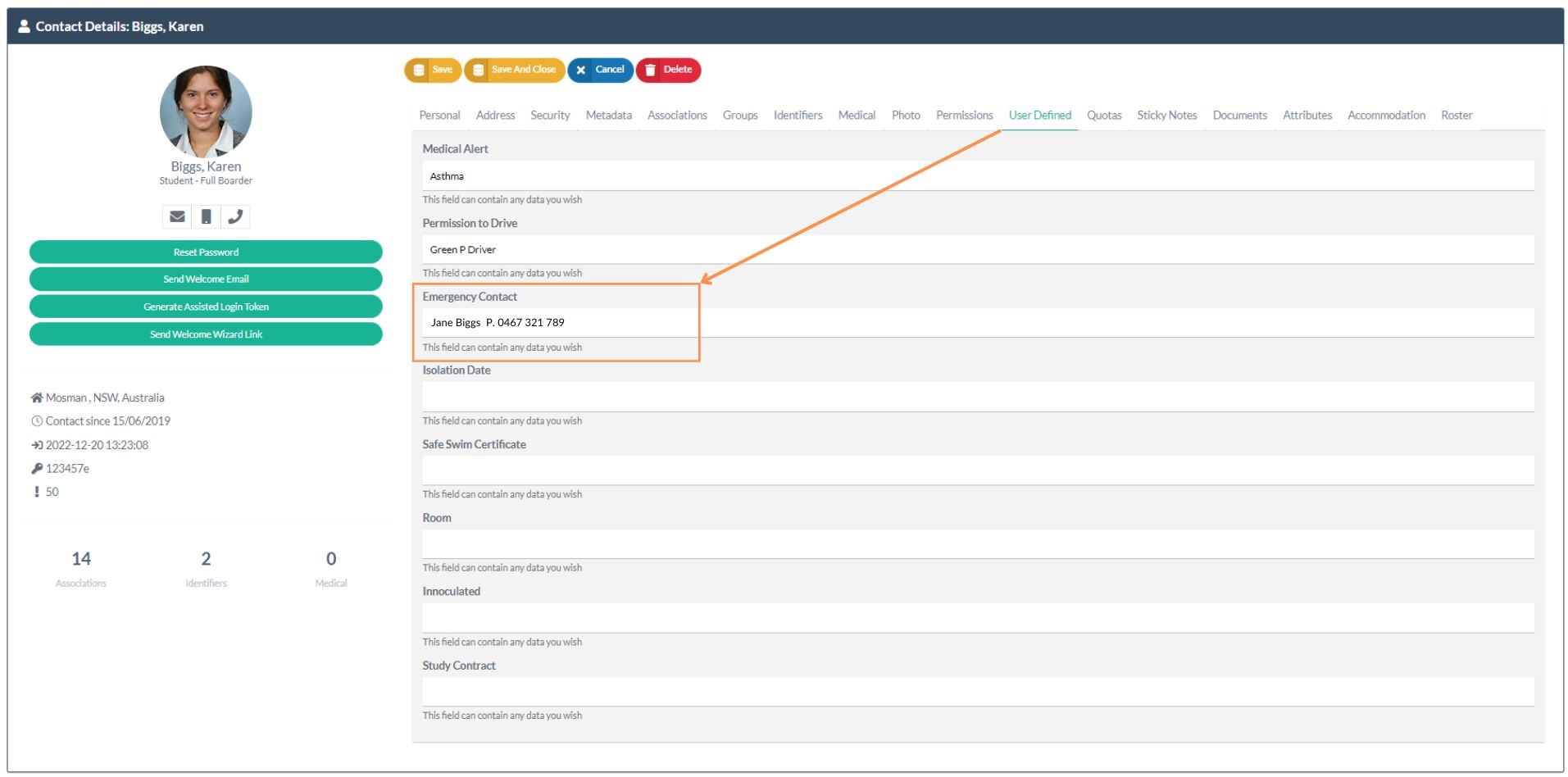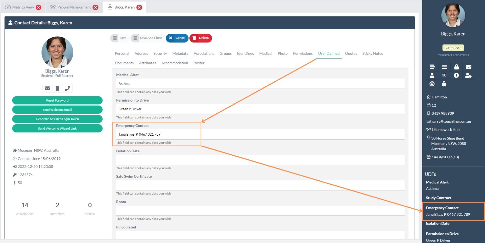 Here you can set a contact profile as the emergency contact, in the example image, Karen's mother Jane Biggs, has been set.