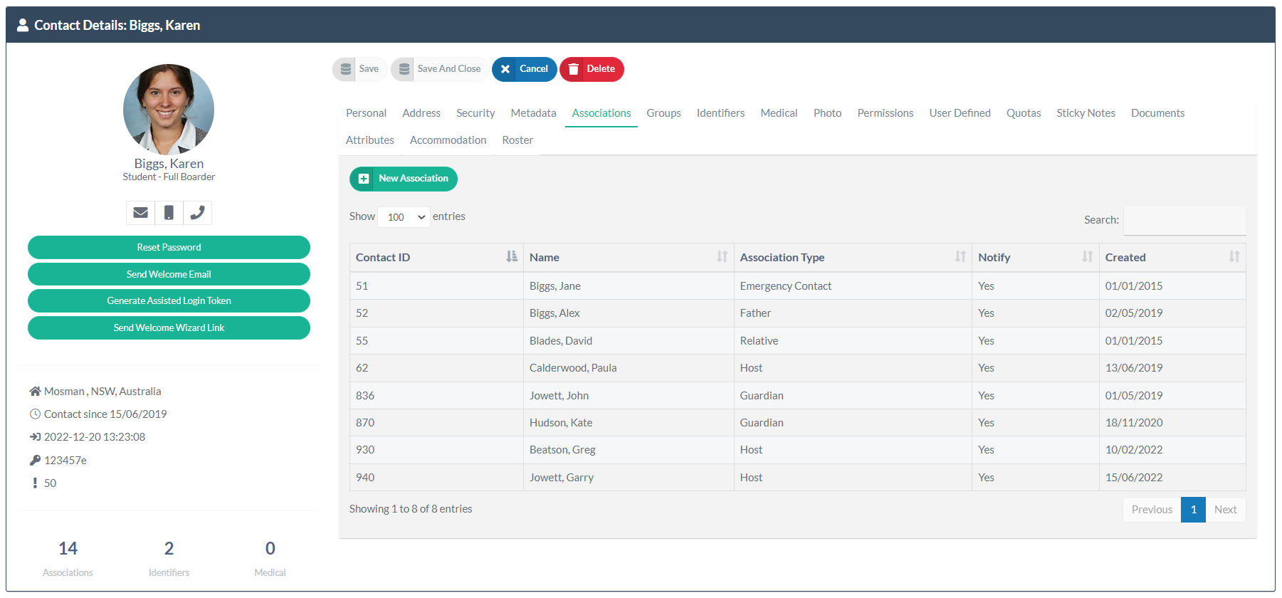 Main Menu >>People Management >> View Contacts >> Profile >> Associations Tab