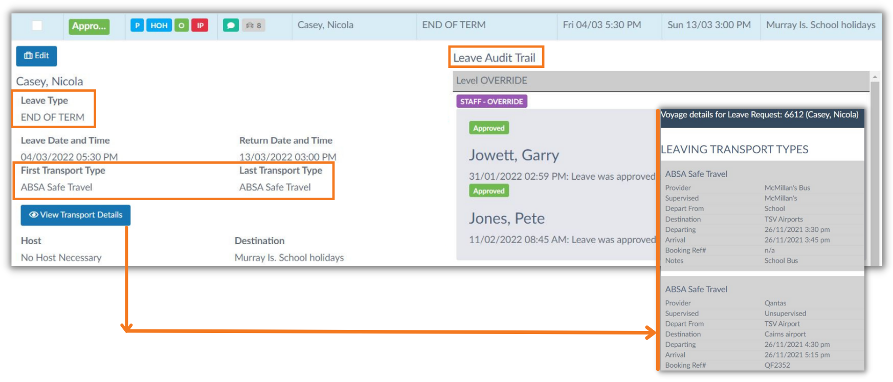 In this example, Nicola Casey has a current leave item detailed and saved in the system, it is for end of term travel and includes multiple legs of transport using the transport type created specifically for the Safe Travel Plan use.