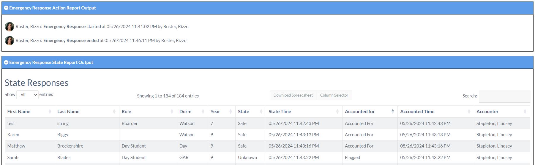 Then next section, State Report shows the status of each person during the emergency event. Some people are marked as Accounted For, one we can see as Flagged, others may be Unaccounted.