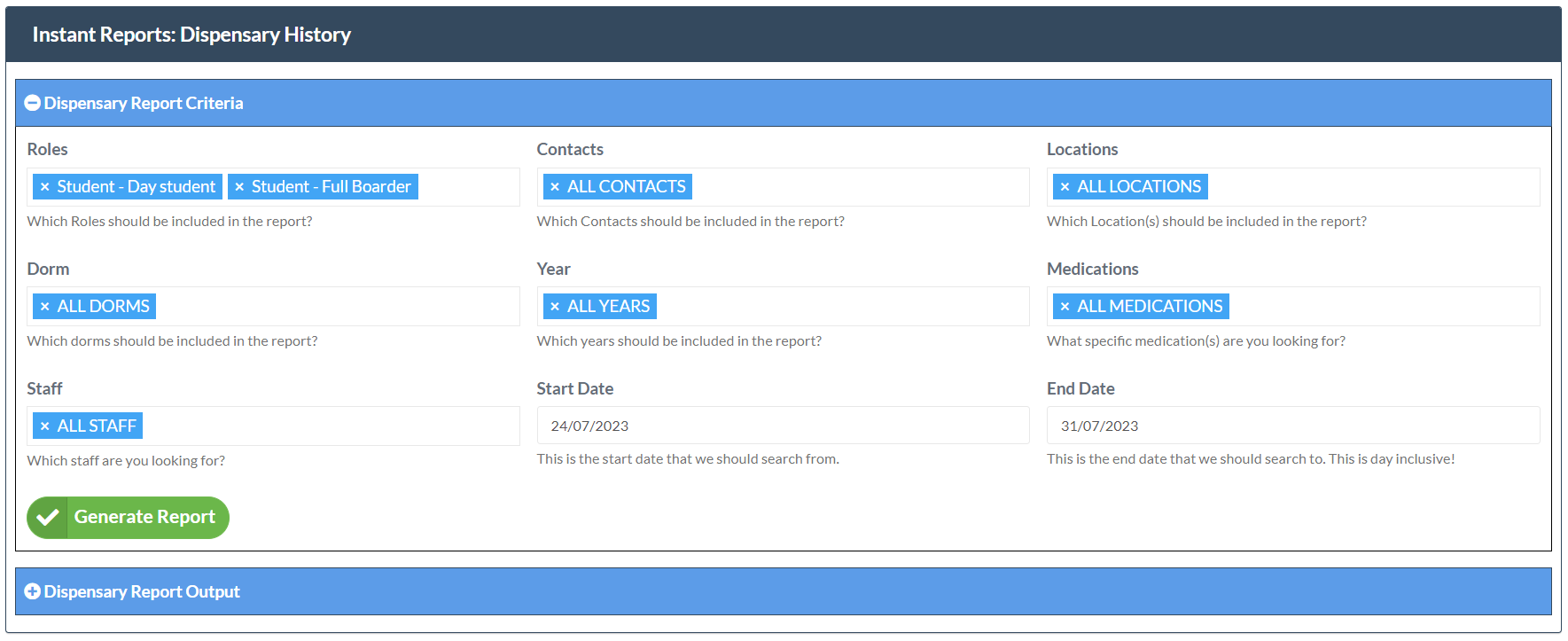 The Dispensary History feature generates data derived from specified parameters throughout a chosen Date Range.