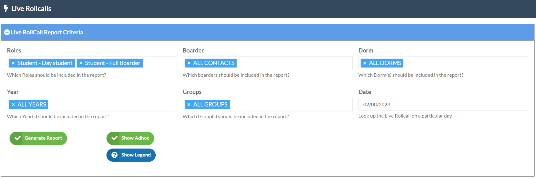 The blue Show Legend button is also provided to detail the parameters of the Live Rollcall types as created and managed by your school.