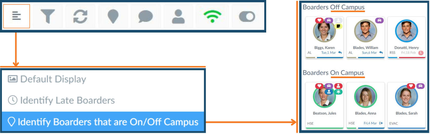 Now there is an added function with the On/Off-Campus filter. This can be used at any time while using the kiosk to quickly split the view and identify those who are off-campus, by pushing them to the top. View and manage students as required and to reset, simply select default to return to the normal view.