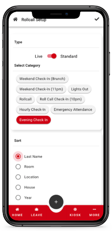 Rollcall can be taken and processed through the Reach Student Life mobile app in one of two ways; Live Rollcall and Standard Rollcall. Live Rollcall will allow staff to work in collaboration with other staff members to quickly and efficiently account for students in one or multiple of locations, enabling others to see real-time updates regarding students' whereabouts. Standard Rollcall allows for one user to log attendance for a group as one event, and other staff won't be able to see the results of a Standard Rollcall until after it has been completed and submitted.