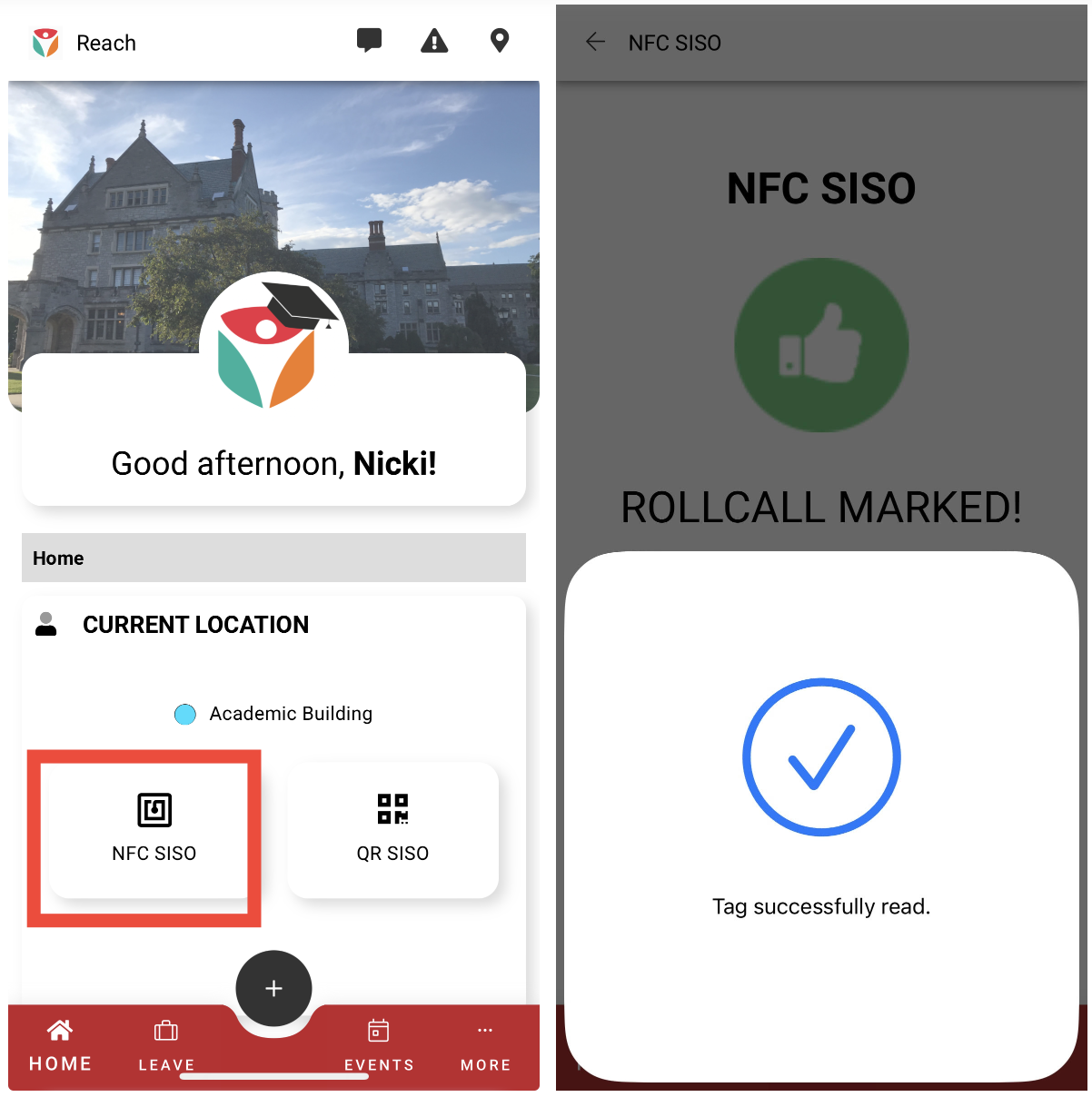 To use a programed NFC tag with a Live Rollcall, open Live Rollcall, select the category. Students will use their phone with the Reach app to check in for the Rollcall by selecting the NFC SISO button on their home screen and will then tap their phone to the NFC tag.