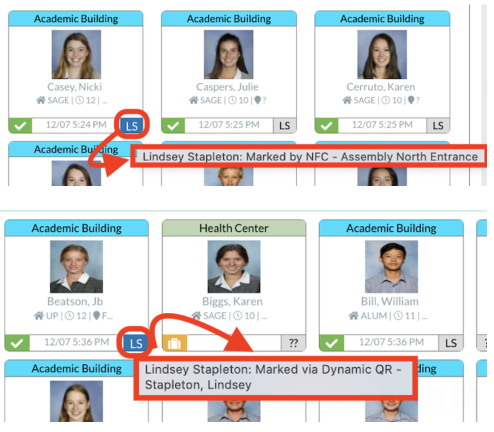 Students marked present via NFC or QR will also include a note with the rollcall mark stating whether they used Dynamic QR or a specific NFC tag to check into the Live Rollcall. These note logs are visible in the Live Rollcall by hovering over the staff initials box, in the Student Sidebar's Rollcall History by hovering over the attendance mark, or in the Student Attendance Over Time report in Reporting > Instant Reports when using the Numeric with Notes output format.