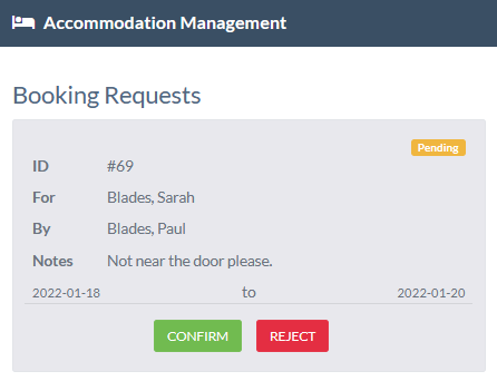 Navigate to Accommodation > Accommodation Management. When a parent or staff member submits a booking request it will need to be approved by a member of staff before the booking becomes confirmed. When a booking request is made, the request will appear on the Accommodation Management Screen as pending where staff can confirm or reject the booking.