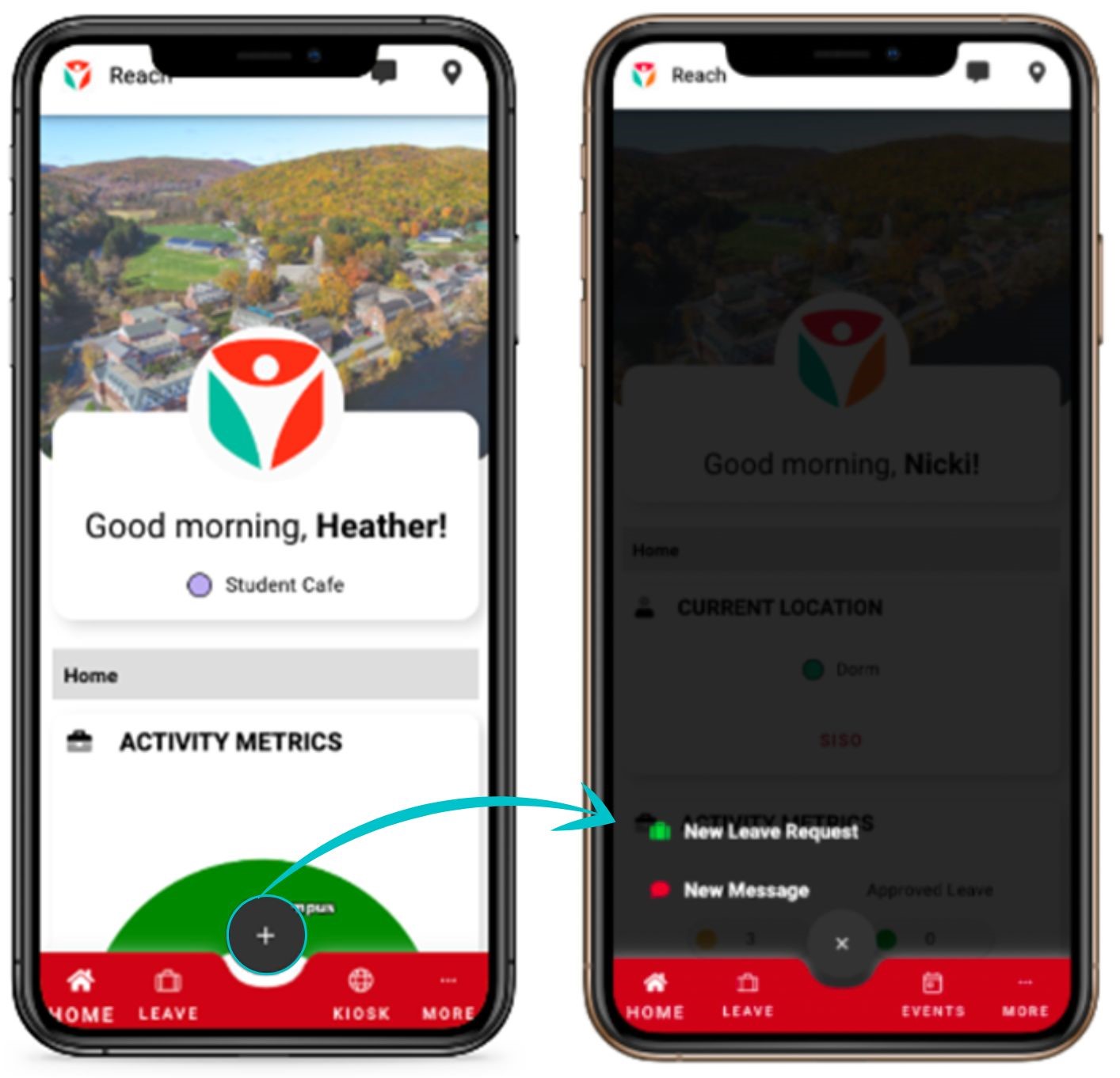 The New Leave Request screen opens with a series of prompted screens as indicated by the active dots at the top of the screen.