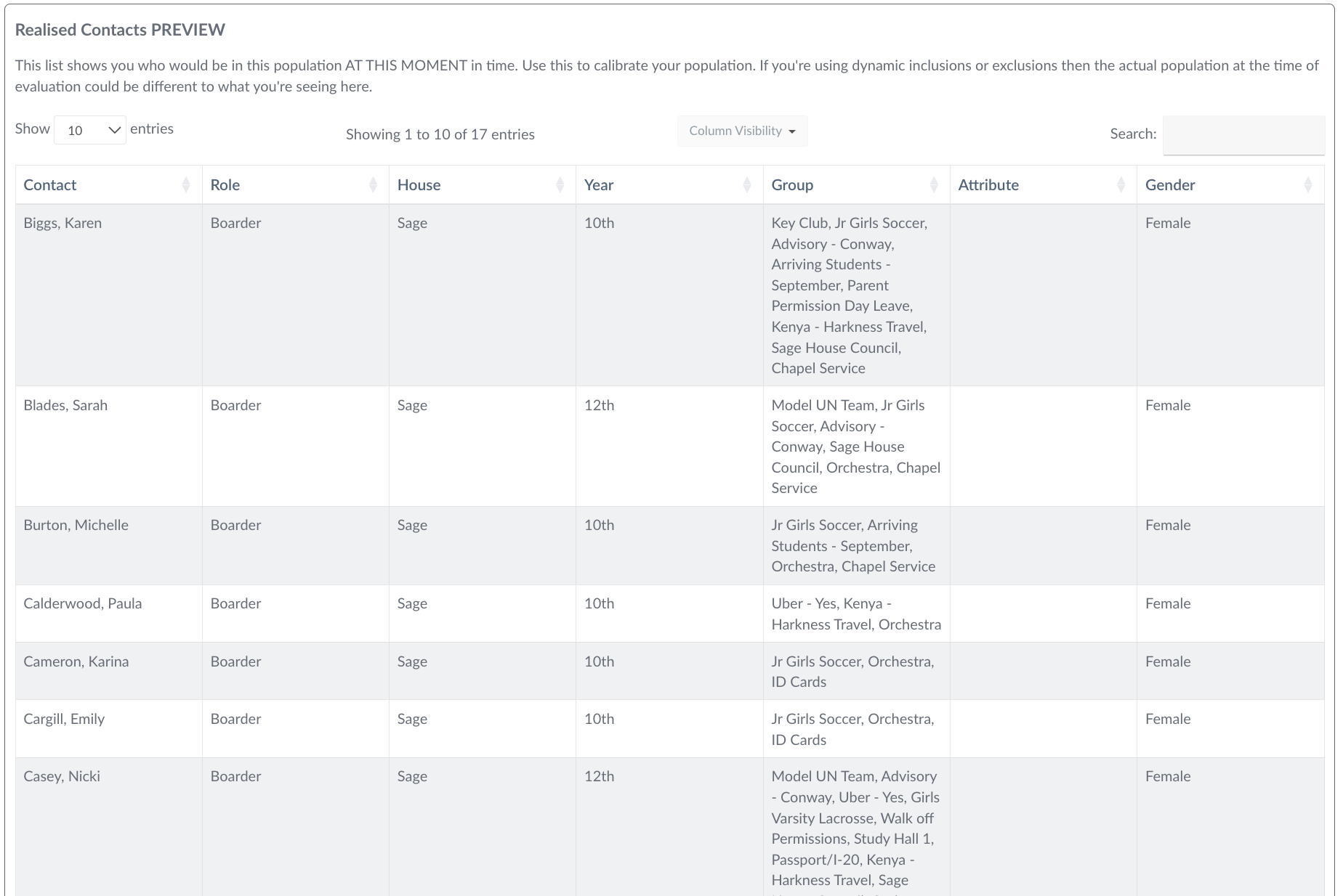 Populations of users can then be pulled together into a dynamic list based upon the criteria set, for example all users that have the Role ‘Students’ that are in House ‘York’ that are in Year ‘10’ and are ‘Male’. A list of users are then displayed as belonging to this Population , users can also be explicitly excluded from the population, for example exclude any Male, Year 10, Students from York that belong to the 'Prefects’ group.