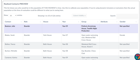 Populations of users can then be pulled together into a dynamic list based upon the criteria set, for example all users that have the Role ‘Students’ that are in House ‘York’ that are in Year ‘10’ and are ‘Male’. A list of users are then displayed as belonging to this Population , users can also be explicitly excluded from the population, for example exclude any Male, Year 10, Students from York that belong to the 'Prefects’ group.