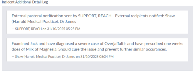 The details submitted by the external contact will then be recorded as additional details in the Pastoral Report, this also includes the action to send the external contact an invite to contribute and when it was sent and by whom.