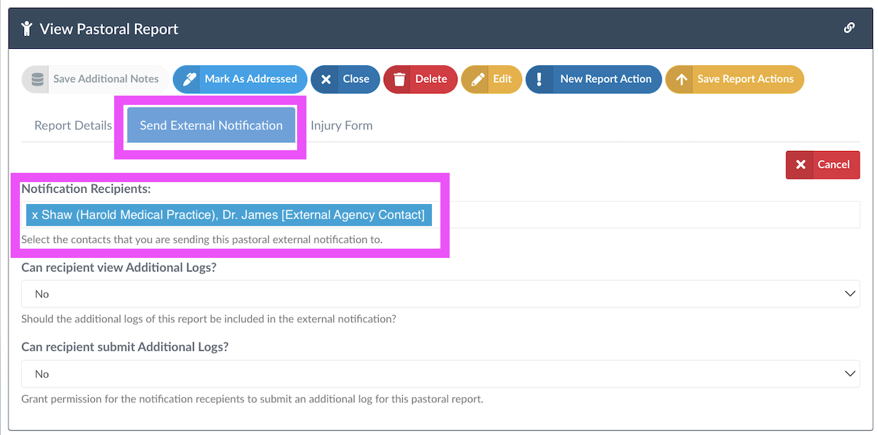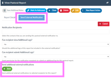 You can invite as many external contacts to contribute to a Pastoral Report at any time, just open the Pastoral Report that you want to invite an additional external contact to be informed or contribute and click on ‘Send External Notification’: