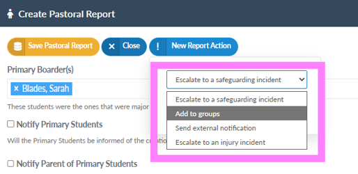 When a member of staff raises a new Pastoral Report and they have the permissions set to escalate a Pastoral Report they will see a the ‘New Report Action’ button: