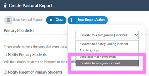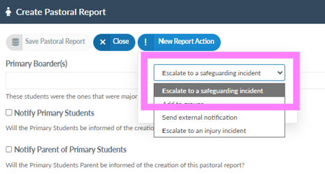 Existing pastoral reports can now be escalated to a safeguarding concern or to record an injury, dependent upon the user having the correct permissions to do so, they also can be escalated to an external agency or the student made a member of a group (see Escalations).