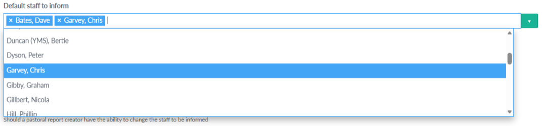This will then pre-populate the Staff to Inform list when a Pastoral Report is raised and the incident type is selected with the staff you set as default. To then lock this down so that the staff creating the Pastoral Report can’t change the staff that are to be informed, just set ‘Lockdown staff to inform’ to ‘Yes' (default is set to No).