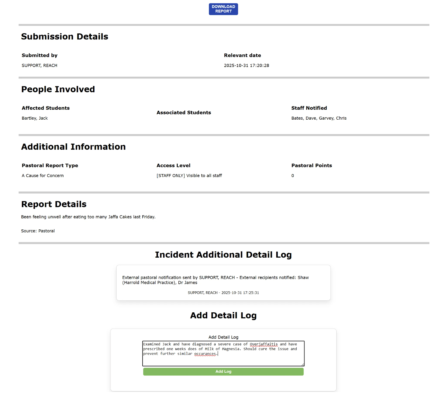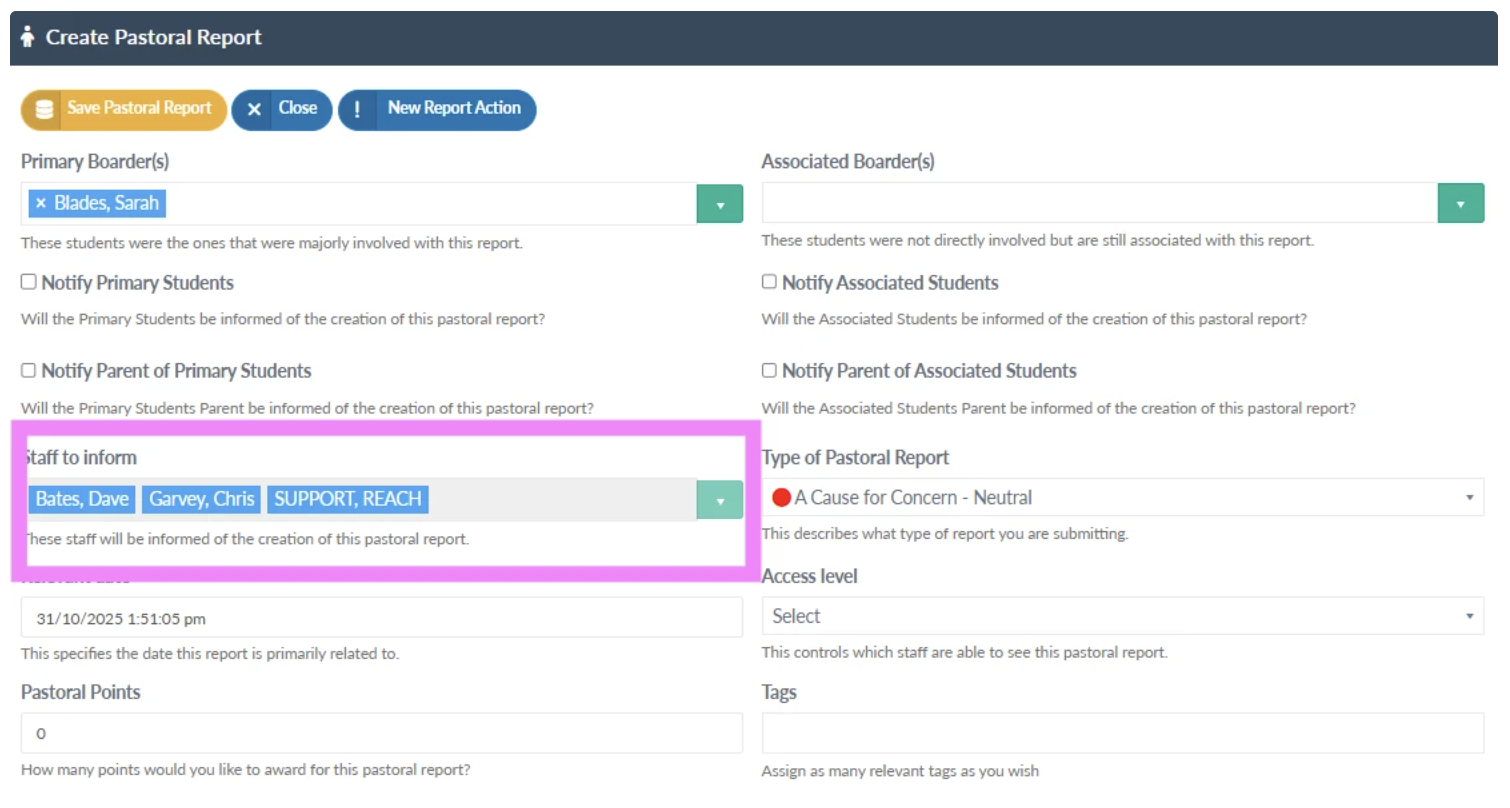 When a pastoral report is created the originator has the ability to choose what individual members of staff, groups or roles to inform about the report. This email notification contained details about the incident, the student(s) involved, who raised the concern, date and time, etc. so that those staff that need to be informed are notified.