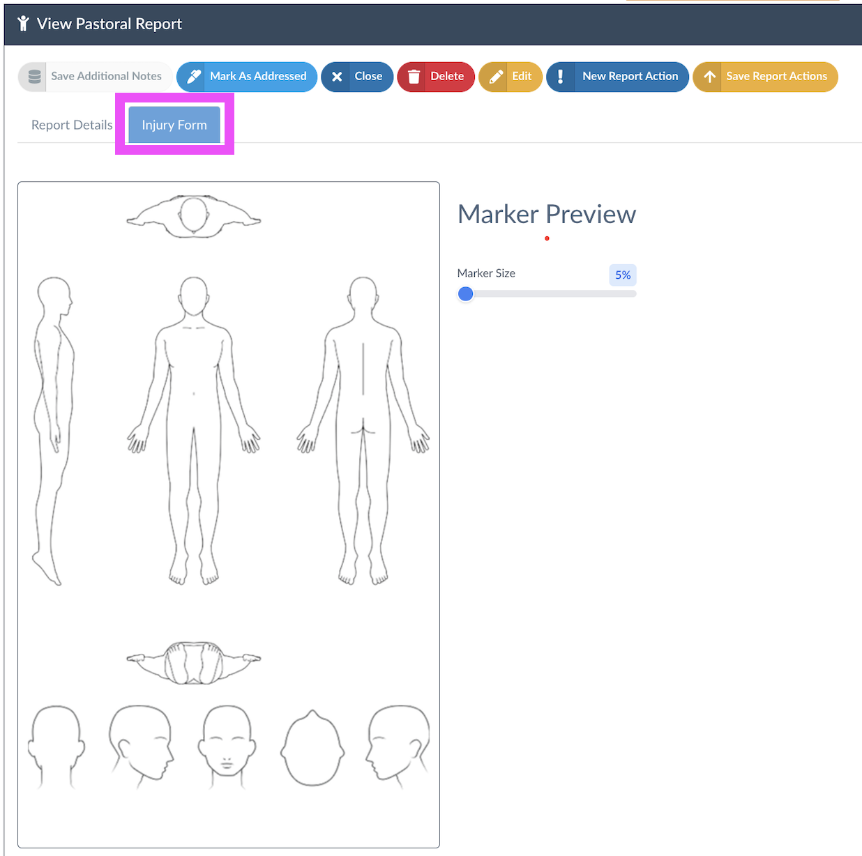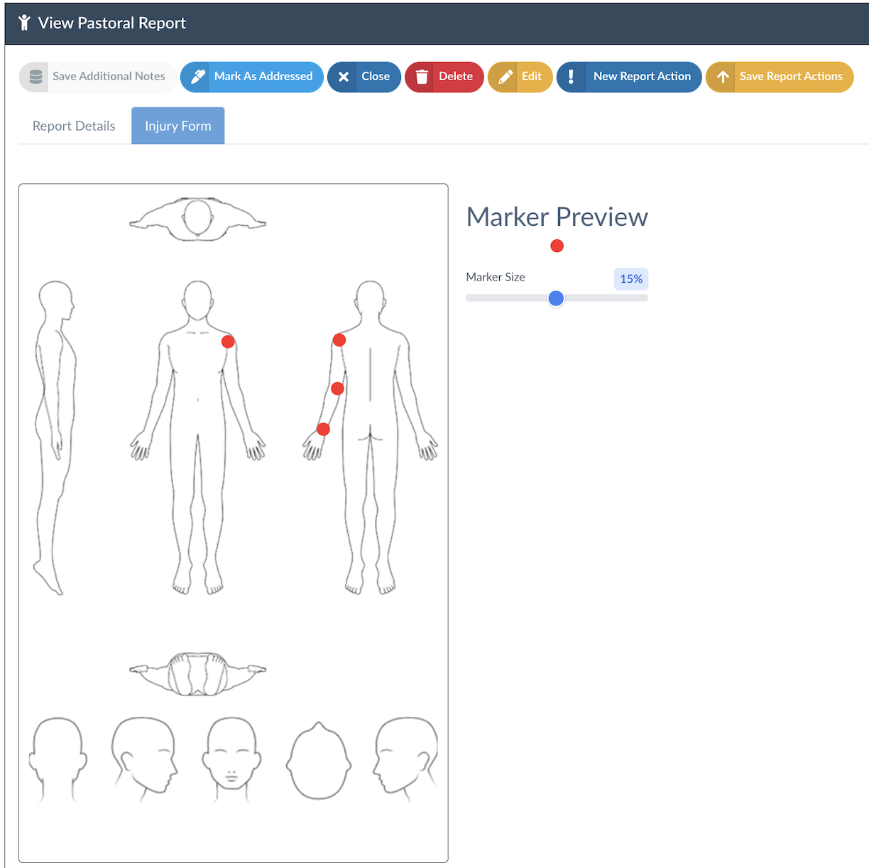 You can now adjust the Marker Size and record any areas where an injury has been observed: