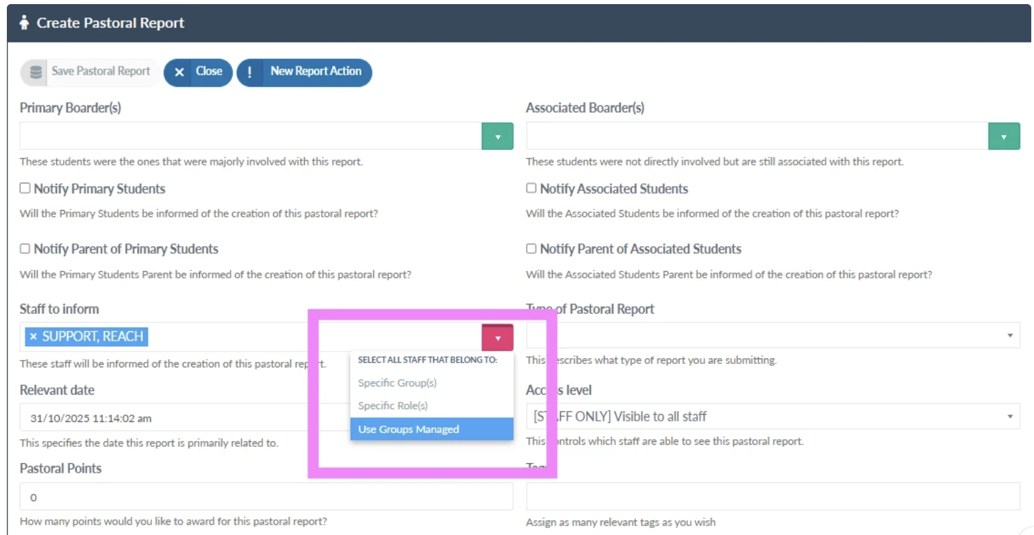When creating a new Pastoral report users now have an additional option when selecting which Staff to Inform, in addition to selecting individual staff members and a specific role or group you can now select ‘Use Groups Managed’. Selecting this will populate the Staff to Inform with ALL staff roles that match the House and Year group of the Primary Student.