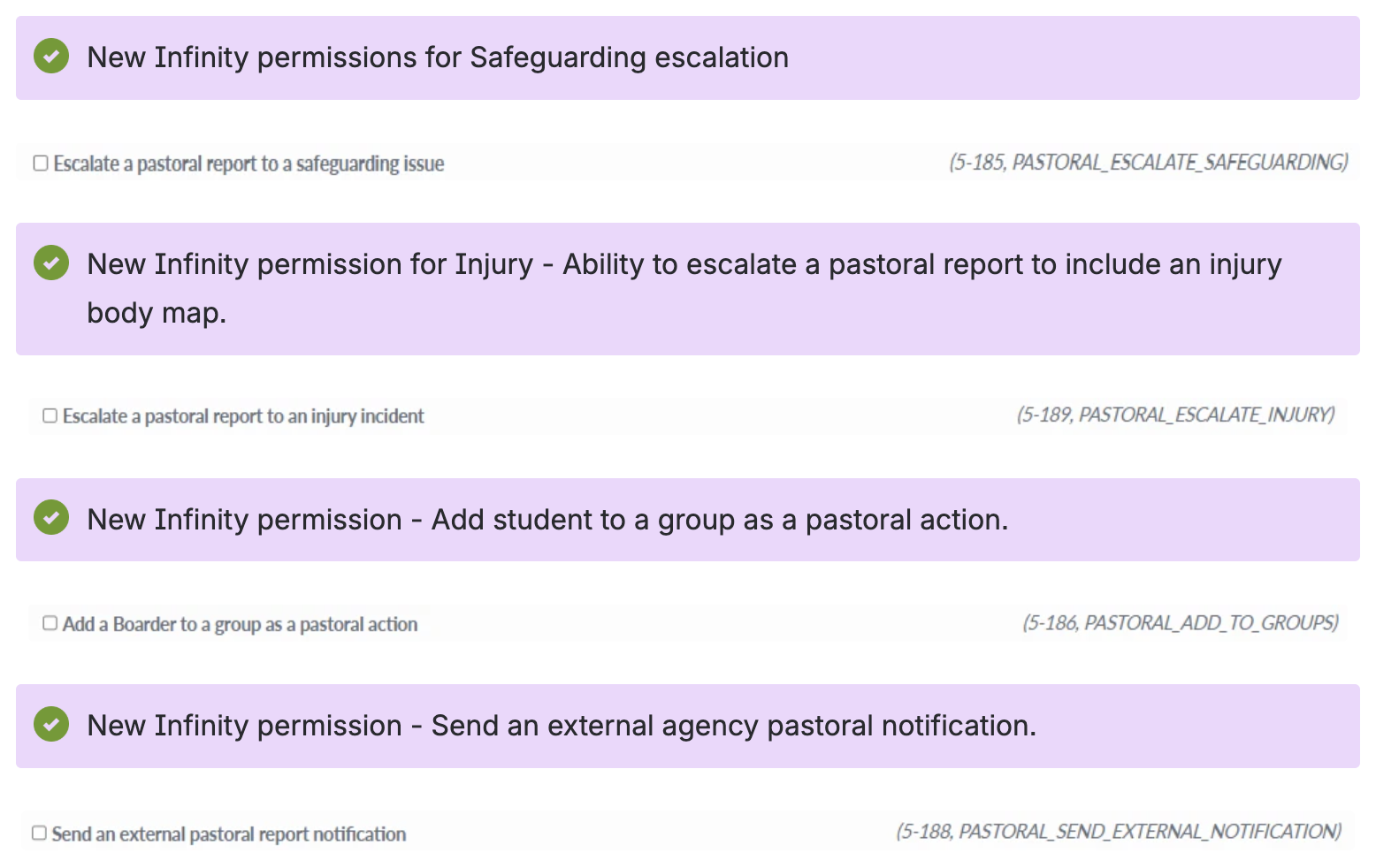 The new Safeguarding and Injury extensions work within this same permission and access based workflow, so in order for a member of staff to see a Pastoral report that has been escalated to Safeguarding and has the access level set to ‘Confidential’ they will still need permission to view a report that has been escalated to Safeguarding AND have Confidential report access.
