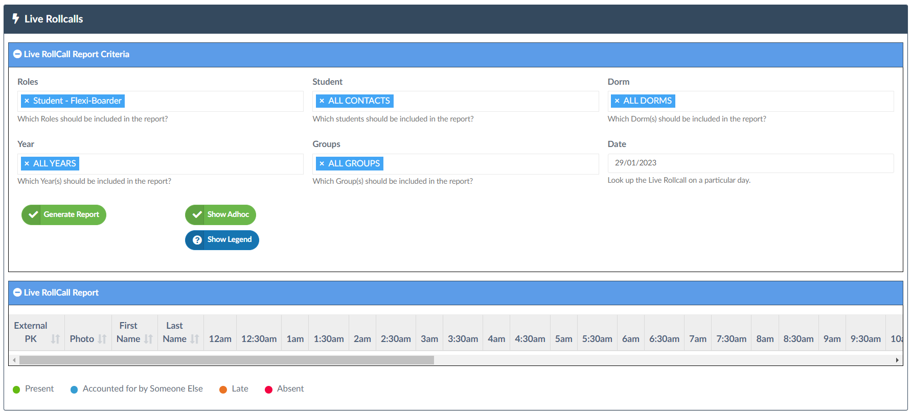 - 'Show Legend' button - provides a pop-up showing the respective rollcall categories and their time/day parameters