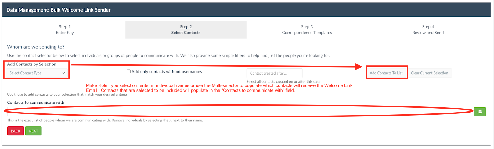 You can select the users that you would like to email by type names in the Contacts to Communicate With box. To bulk select users, either select from the Contact Type drop down, enter in individual names in the "Contacts to Communicate With" field or use the green Bulk Selection icon on the right; in addition from being able to select individual users to add as Selected Contacts, you can select from various filters such has Dorm, Grade, Group or Role Type to quickly select all who fall into those categories. Back on the Step 2 page for Selecting Contacts in the Quick Shortcuts section, you can quickly select "add only contacts with usernames" and set a date for only adding contacts created after a specified date. When finished, click Next.