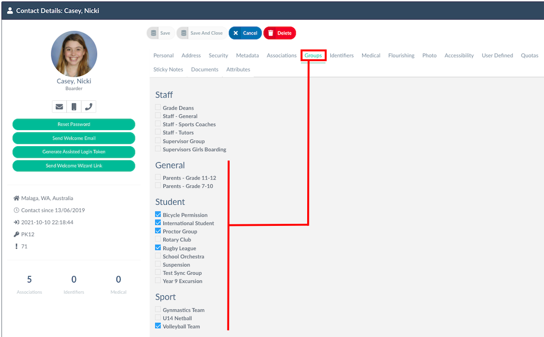 - Students can be assigned to groups that are formatted as Student groups, General groups or Sport groups.